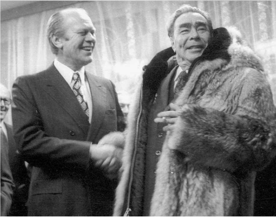 Встреча Брежнева с Джеральдом Фордом. Брежневу понравился шуба из «Аляскинских волков». Фото с сайта fishki.net.