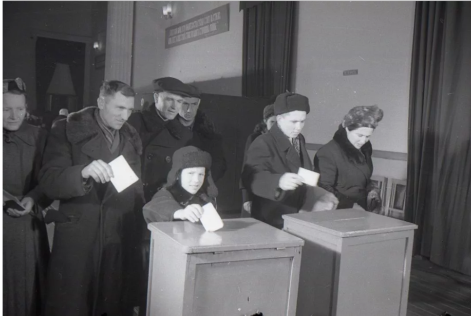 На избирательных участках в эпоху развитого социализма в СССР торжествовала «социалистическая демократия». Выборы превращались в праздник – в стопроцентную демонстрацию «единства партии и народа»: сто процентов избирателей (ну хорошо, 99 процентов) являлись на избирательные участки и голосовали за единственного кандидата от «блока коммунистов и беспартийных».