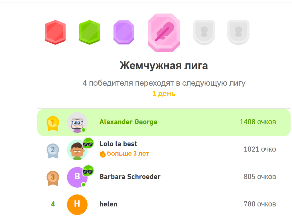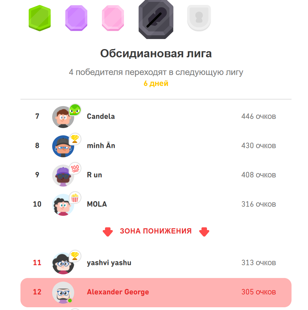 На последнем скриншоте 5 показана моя грустная позиция в более трудной «Обсидиановой лиге», в которую меня сегодня перевела система DuoLingo. Тут ребята из разных стран за один день набирают столько очков, сколько в «Жемчужной» набирали за неделю. Я много раз оказывался в этой «Обсидиановой лиге», но ни разу не удалось подняться выше. Эта лига дает мне прочувствовать, чем я отличаюсь от настоящих фанатов, которые просиживают каждый день по несколько часов.