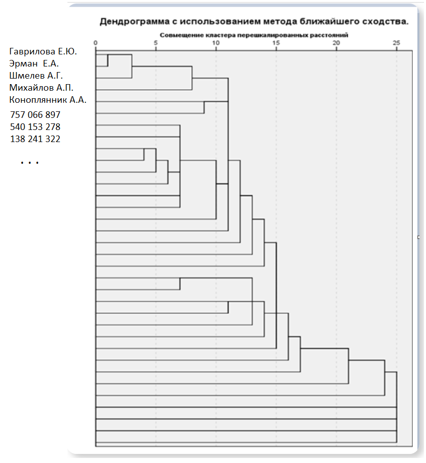 На скриншоте 2 Вы видите, как выглядит дерево автоматической классификации экспертов (по близости профилей оценок в каждой паре экспертов). Наверху дерева ветки более плотно связаны друг с другом — в некоторый «пучок». Это ядро согласованных экспертов. А внизу дерева располагаются те эксперты, которые чаще попадают «в молоко».