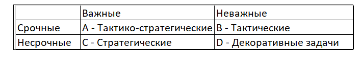 Таблица 1: Общая классификация задач (по срочности и важности)