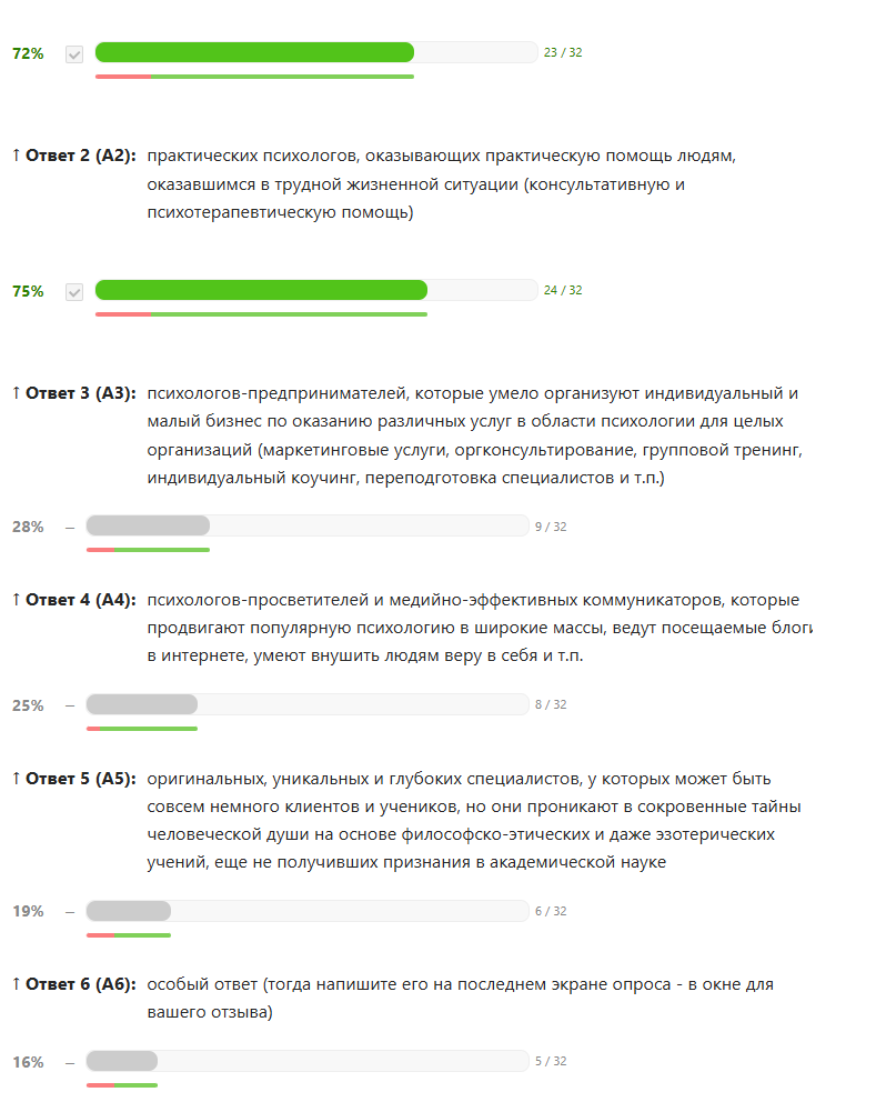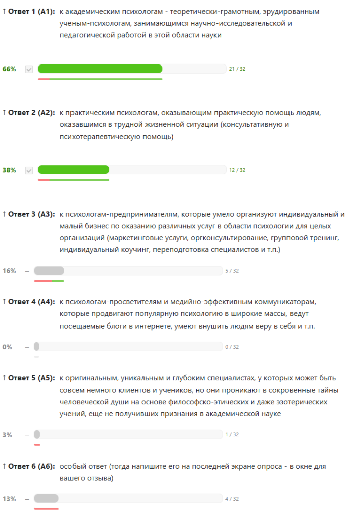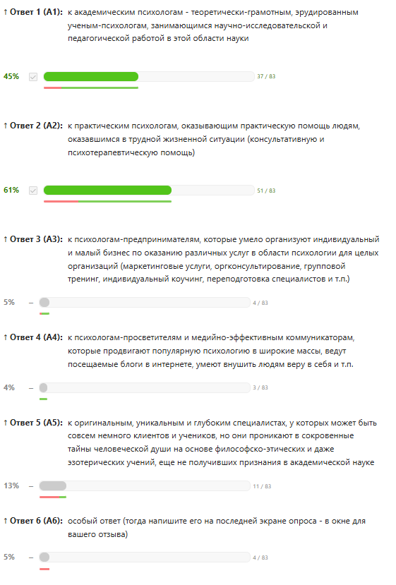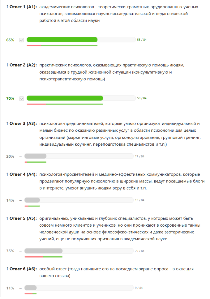 Оговорка. Дорогие читатели, прежде, чем Вы познакомитесь с моими выводами, я должен Вас честно и самокритично предостеречь от поспешного чрезмерного доверия к полученным в этом опросе результатам. Все дело не только в численности выборки, но и в таких вполне возможных методических недочетах, как отсутствие в схеме опроса мер по нейтрализации «артефакта позиционных ответов». Признаться, что это можно было сделать технически — включить рандомизацию (перемешивание) порядка следования ответов, но я как-то легкомысленно об этом не подумал вовремя 🙁 Видимо, это произошло потому, что мне хотелось, чтобы побольше респондентов на первом же экране «узнали самих себя» и приняли участие, а не отвергали бы идею такого опроса «с порога». Так что… нельзя сбрасывать со счетов такую банальную гипотезу, что первые группы (академики и практики) получали в этом списке больше «плюсиков», потому что были банальным образом первыми упомянуты в статическом (неизменном для всех) порядке следования ответов на экране друг под другом. Если Вам интересно собрать информацию, устранив этот дефект, пишите запросы в своих комментариях, и мы постараемся вместе с редакцией «Психологической газеты» приложить усилия к тому, чтобы собрать данные на «контрольной группе респондентов», на которой этот возможных артефакт будет устранен.