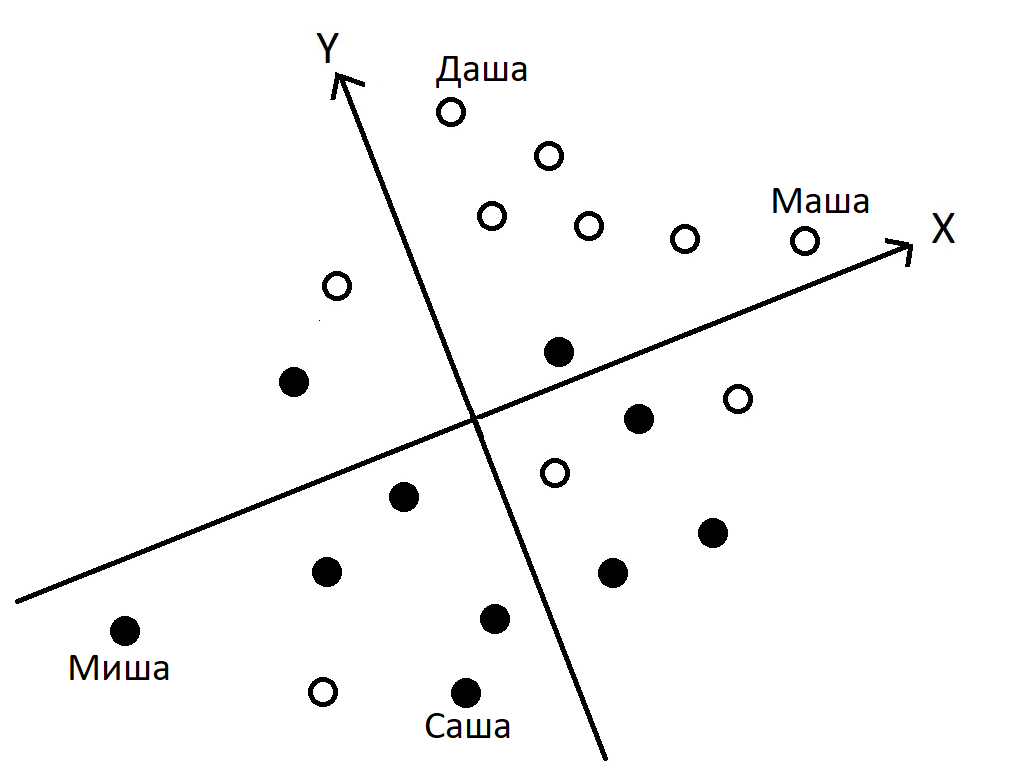 Но давайте не будем рисковать и для еще пущей наглядности все-таки подпишем хотя бы четыре изображающие точки именами, как это показано на рисунке 1. Чем примечательны Даша и Маша? — У Даши самый высокий результат по русскому языку (ортогональная проекция на ось Y дает самый высокий результат именно для точки по имени «»Даша»). А у Маши самый высокий результат по истории (самое высокое значение по оси X). Соответственно у Саши самый низкий результат по русскому, а у Миши — по истории. Видно это вам на рисунке 1, да? — Ну если видно, то я очень рад этому! Поехали дальше…