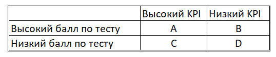 Аналогично правая нижняя таблица показывает нам, что тест по истории, напротив, лучше работает как тест отбора. Его эффективность при разделении «высокой группы» (белых шапочек) достигает 80%, а при разделении низкой группы — только 60% (в правую нижнюю клеточку D в этой ЧТС попадают только 6 черных шапочек).