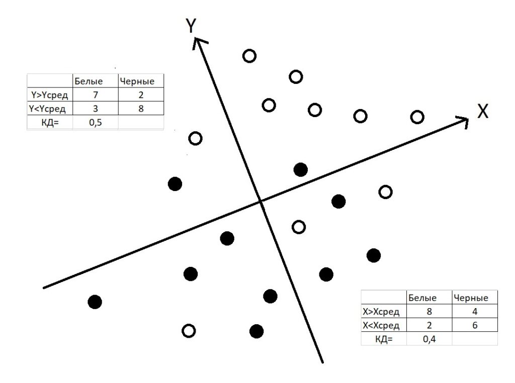 Вы тут можете спросить: «А зачем разделять мальчиков и девочек? И что это за глупый тест такой?». Ну тогда давайте предположим, что мальчики и девочки выполняли у нас два теста: тест X — это тест по истории, а тест Y — это тест по русскому языку. Ну и так получилось, что девочки выполнили оба теста лучше, чем мальчики: большинство девочек и по тесту X, и по тесту Y показали результат выше среднего, а большинство мальчиков — ниже среднего (хотя и в том, и в другом случае были исключения). Вот теперь у нас возникает ситуация близкая к такой, которую мы имеем при проверке валидности тестов, но только «девочки» — это у нас «высокая группа» (работники с высоким KPI), а мальчики — это «низкая группа» (работники с низким KPI). Иными словами: белые кружки обозначают местоположение работников из высокой группы (в пространстве результатов по двум тестам X и Y), а черные кружки — местоположение работников из низкой группы.