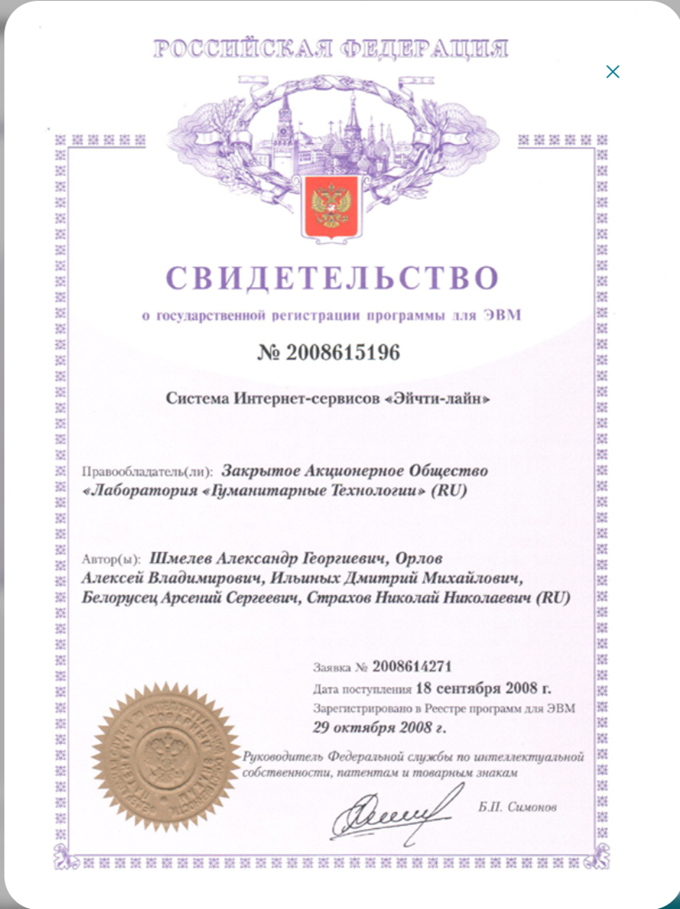 Скриншот 2. Авторское свидетельство на систему Интернет-сервисов «Эйчти-лайн» (или Ht—Line) от 2008 года.