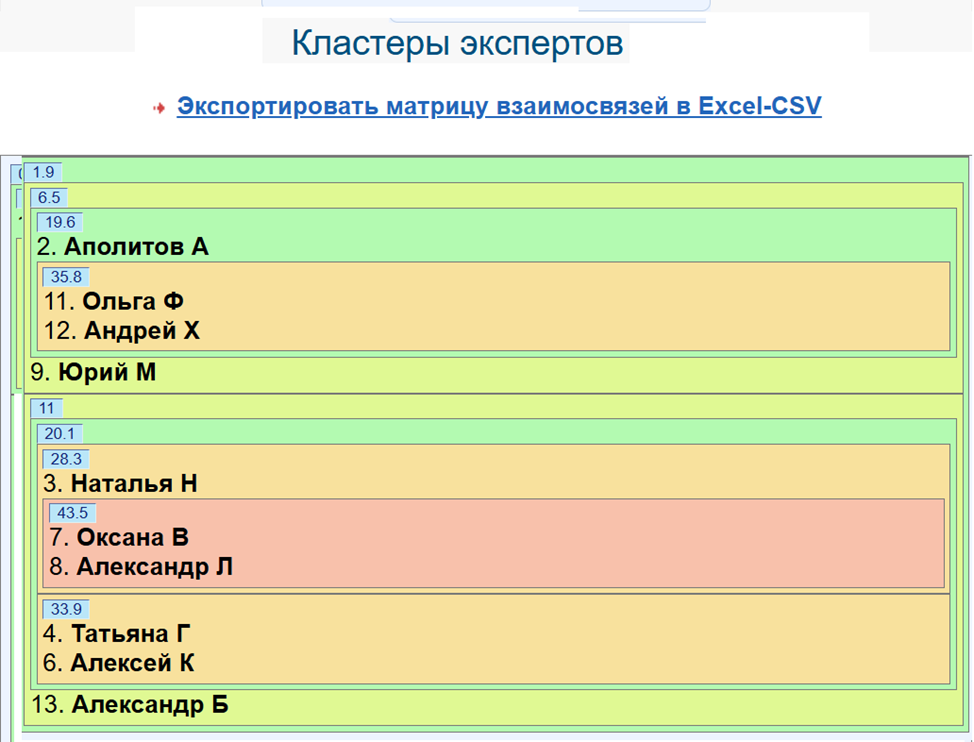 В систему Ht-Line 2.0 встроен автоматизированный блок кластерного анализа для выявления ядра согласованных экспертов и некоторых экспертов, которые НЕ дают необходимого уровня согласованности в своих оценках качества тестовых заданий. На скриншоте 4 показано, как выглядят результаты кластерного анализа. В этом случае к более многочисленному ядру согласованных экспертов принадлежит группа в составе 6 человек: Оксана В., Александр Л., Татьяна Г., Алексей К., Наталья Н., Александр Б. Наименее точным в свои оценках оказался эксперт Юрий М., суждения которого вполне можно исключить из базы данных.