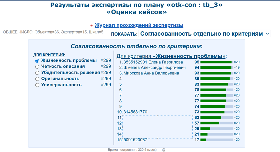 Скриншот 7. Рейтинг согласованности экспертов по результатам оценивания кейсов по отдельному критерию «Жизненность проблемы».