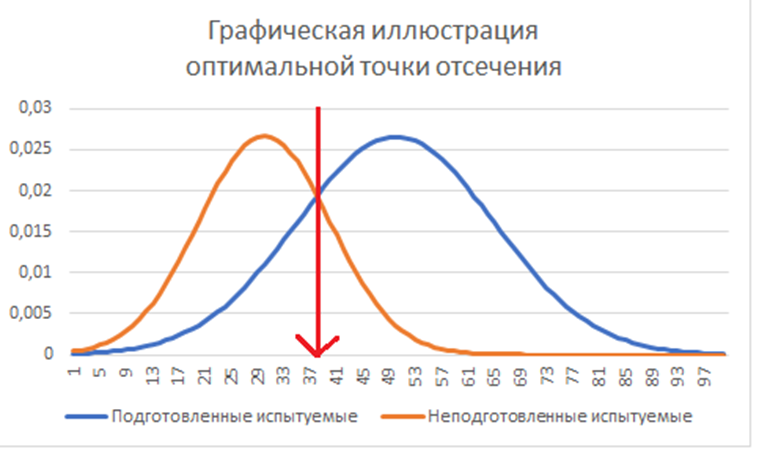 Если точка отсечения проходит на пересечении двух кривых, описывающих распределение тестовых баллов для двух этих разных категорий испытуемых, то она, как правило, оказывается оптимальной для сокращения вероятности ошибок первого и второго рода (ошибок типа «пропуск», когда недостойному соискателю присваивается оценка «сдано», и типа «ложная тревога», когда достойному соискателю присваивается оценка «не сдано»).