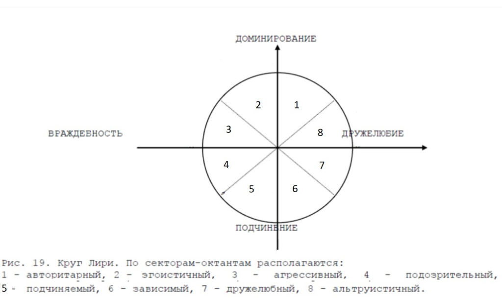 Очень популярна также циркограмма типов отношений, которая используется в чек-листе из 128 пунктов Лири-Ла Форга. Два фактора на этой циркограмме — это «Дружелюбие» и «Доминирование». Рисунок приводится здесь мной в том виде, в каком он опубликован в моей монографии 2002 года «Психодиагностика личностных черт»: