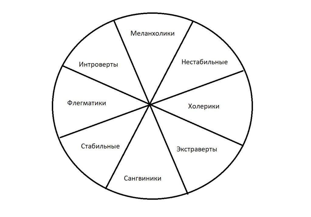 Пожалуй, самой популярной циркограммой в психологии является известный «круг Айзенка». Его нельзя не упомянуть в том контесте, хотя я его не раз критиковал, ибо и сам автор был не совсем точен в наполнении секторов словами (обозначающими личностные черты), а тем более в переводе на русский допущены разные дополнительными ошибки. Так что в интернете вы найдете явные противоречиями между разными публикациями «круга Айзенка» на русском языке.