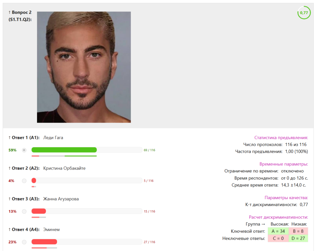 В заключение этой короткой статейки, я приведу парочку скриншотов со статистикой ответов на поздравительный тест 8 марта, и Вы тогда поймете, почему он получил шуточное название «Я — ваша тетя» и, возможно, Вы немножко улыбнетесь. Ведь большая часть заданий теста — это фотографии известных артистов кино и шоу-бизнеса, у которых с помощью «нейронок» был трансформирован пол.