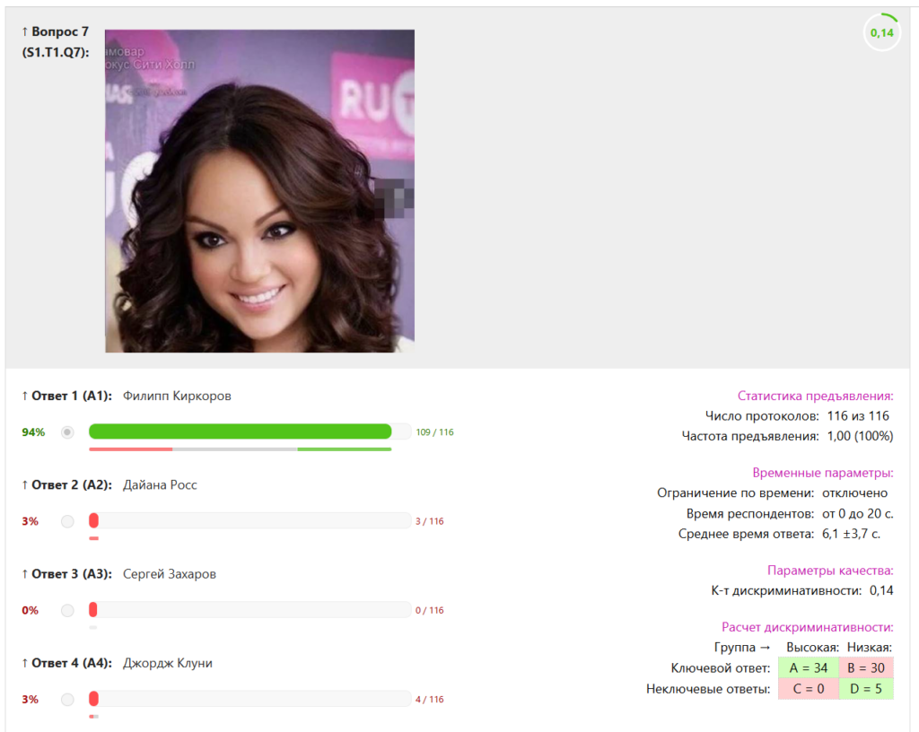 Скриншот 2. А это самое неудачное задание. У него оказалось самое низкое значение КД (только 14%), то есть оно не различает сильных и слабых участников. Почему так? — Потому что это слишком легкое задание: более 90% испытуемых дали правильный ответ.