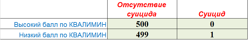 Допустим, что у нас есть ровно 1000 случаев. С половиной из них поработали психологи с высоким (или средним) баллом по тесту КВАЛИМИН, а с другой половиной консультанты с низким баллом. Предположим, что только один случай из 1000 оказался несчастным и завершился суицидом пациента. И этот случай произошел у консультанта с низким баллом. Почему? — Причины могут быть разными. Но в том числе это может быть результатом незнания этим «практиком» элементарных правил и процедур применения психодиагностических методик, которые должны-то, по идее, предварять всякую серьезную психотерапию. Если по результатам таких методик выявляется «острая депрессия на грани суицидального риска», то психолог обязан отказаться от работы с таким пациентом и СРОЧНО ПЕРЕНАПРАВИТЬ его врачу-психиатру, имеющему право (и обязанность) назначить медикаментозное лечение. Но… «практик» не знает ни этого профессионально-этического норматива, ни владеет психодиагностическими методиками вовсе, а считает возможным «работать на глазок»… Увы, таких практиков у нас сейчас БОЛЬШИНСТВО (!).