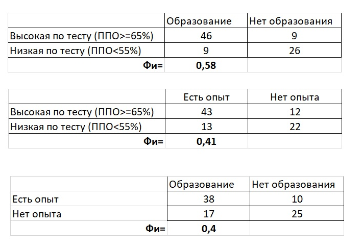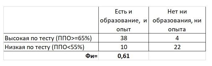 Ну а какой же оказалась у нас пока ФИ-сопряженность, если у одних испытуемых наблюдается комбинация «образования плюс опыт», а у других — «ни образования, ни опыта»? Естественно, что мы прогнозируем в этом случае рост связи. Так и есть!