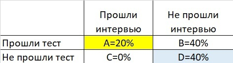 Можете проверить себя прямо сейчас и подсчитать КД для указанного на рисунке примера. Этот КД будет выражать меру прогностичности теста в отношении результатов интервьюирования.