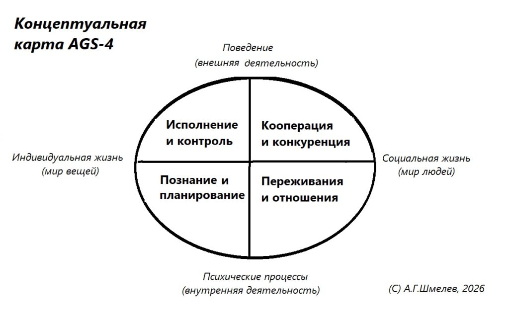 Как видите, в моей схеме горизонтальная ось имеет похожий смысл с тем, что мы видим на рисунке 1, а вот вертикальная осмысляется совершенно иначе — в таких терминах, которые трудно ожидать от традиционного американского бихевиоризма (напомню, что перечни компетенций там до сих пор создаются главным образом под лозунгами бихевиоризма: компетенции — это наблюдаемое «организационное поведение»).