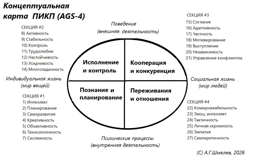Поэтому я разработал концептуальную карту, которая объединяет 27 факторов ТЕЗАЛа в 4 взаимосвязанные секции. Модель отражает полный цикл жизнедеятельности личности: от внутренних переживаний через познание и исполнение к кооперации — и обратно к новым переживаниям.